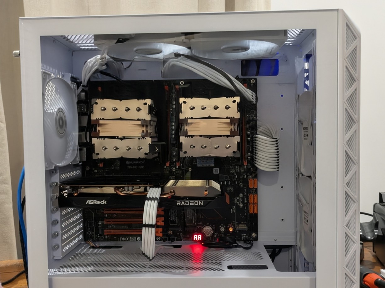 If you made it this far, you are probably interested in building a dual CPU server. I did not scrimp on parts. The motherboard was a gamble, but it turned out ok. You can find fans and coolers cheaper than my prices, at least in November, and you are likely to have some parts lying about. The Minecraft servers are fast, and the network speed is astronomical. Running Git is instantaneous. I'm really happy with the way this project turned out.